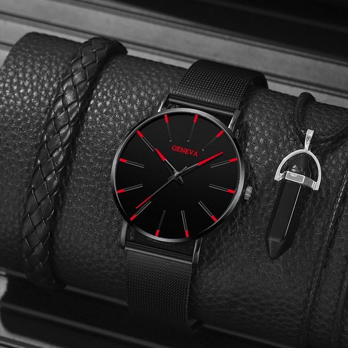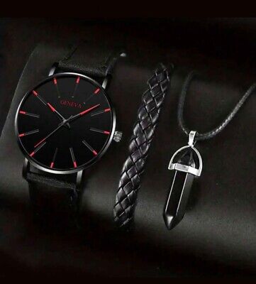 • This stylish watch gift set for men includes a sleek black quartz wristwatch with a faux leather bracelet and a necklace pendant.