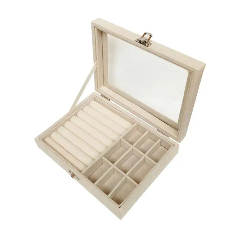 - This velvet-lined jewelery box has a clear acrylic lid.